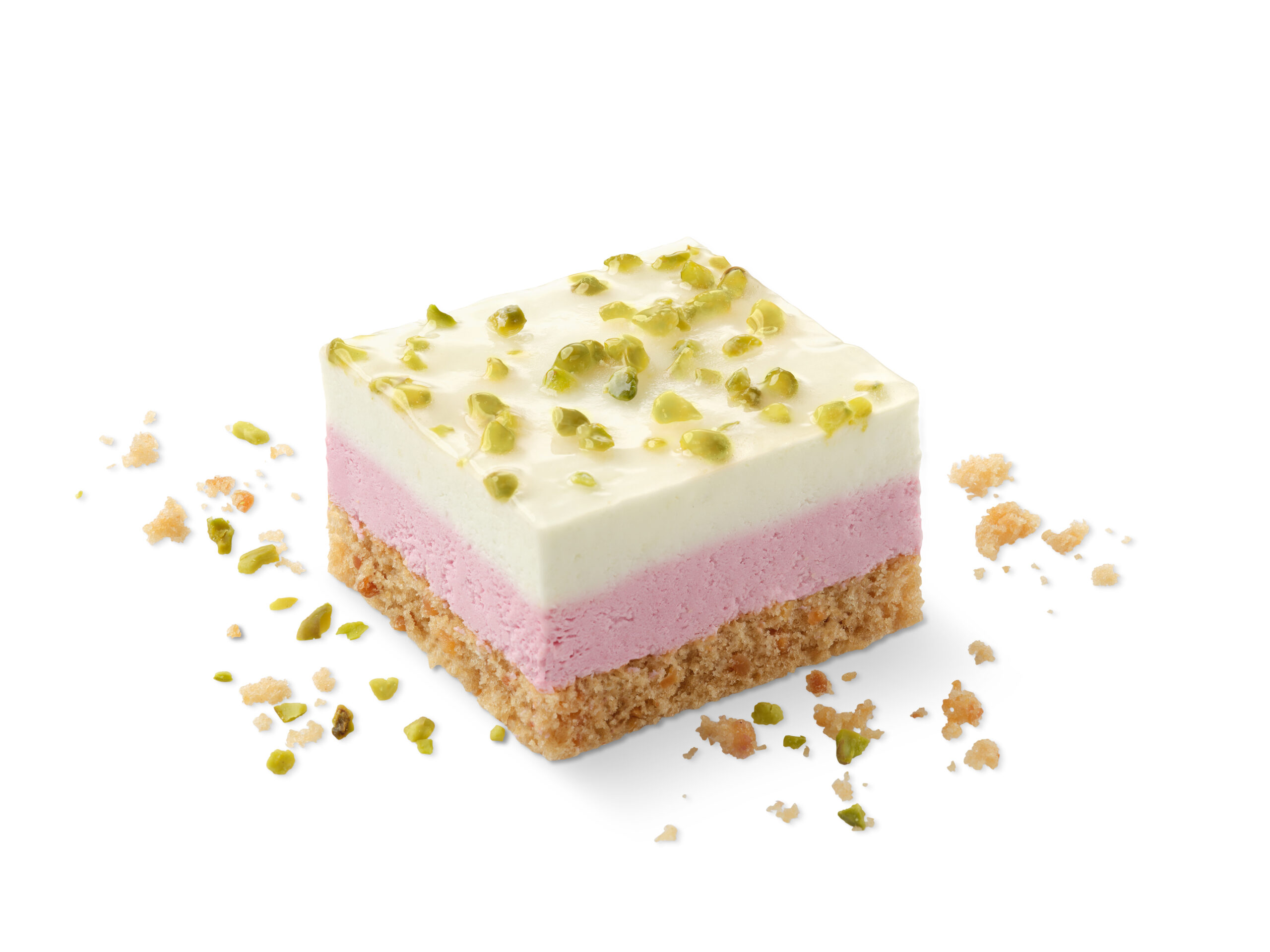Näyttävä kolmikerroksinen leivos, jossa mantelipohjan päällä on raikasta vadelmalla ja limellä maustettua kermamoussea. Päälle on ripoteltu runsaasti hienonnettua pistaasia. Valmiiksi leikattu 15 annospalaan. Kaunis ja värikäs leivos vitriiniin ja kahvipöytään!